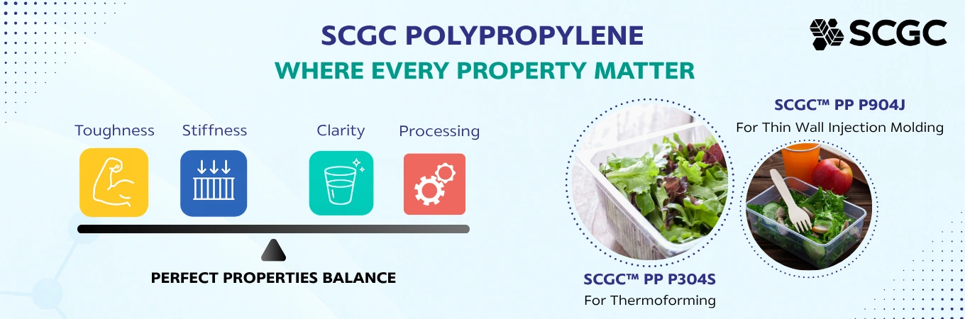 • SCGCTM PP P304S – specially developed for Thermoforming process, offering superior clarity, rigidity, and forming stability that deliver both visual appeal and production consistency.