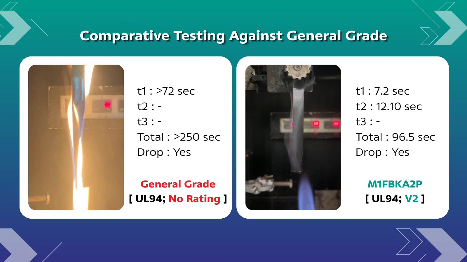 • UL94 V-2 (Vertical Burning) - Flammability Classification: Guarantees the ability to stop flame spread within a specified timeframe according to the UL94 V-2 standard at 3 mm thickness, ensuring reliable flame retardancy.