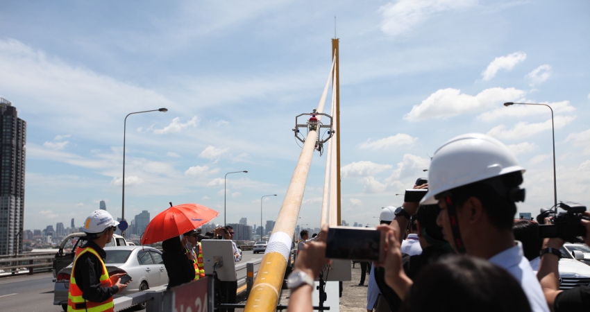 เอสซีจี เคมิคอลส์ โดยสมชาย หวังวัฒนาพาณิช (ที่ 3 จากซ้าย) ผู้ช่วยผู้จัดการใหญ่-ปฏิบัติการ เอสซีจี เคมิคอลส์ ร่วมกับ การทางพิเศษแห่งประเทศไทย (กทพ.) โดยณรงค์ เขียดเดช (ที่ 4 จากซ้าย) ผู้ว่าการ กทพ. แถลงข่าวความก้าวหน้าโครงการวิจัยและพัฒนานวัตกรรมเพื่อการบำรุงรักษาและตรวจสอบโครงสร้างพื้นฐานคมนาคม ได้แก่ นวัตกรรมกำแพงกันเสียงจากวัสดุไวนิล เพื่อช่วยลดมลภาวะทางเสียง และป้องกันเสียงรบกวนจากถนนสู่ชุมชน และนวัตกรรมหุ่นยนต์ตรวจสอบสายเคเบิล (Cable inspection Robot) ที่ออกแบบให้กับ กทพ. โดยเฉพาะเพื่อใช้ในการตรวจสอบสภาพสายเคเบิลของสะพานแขวน