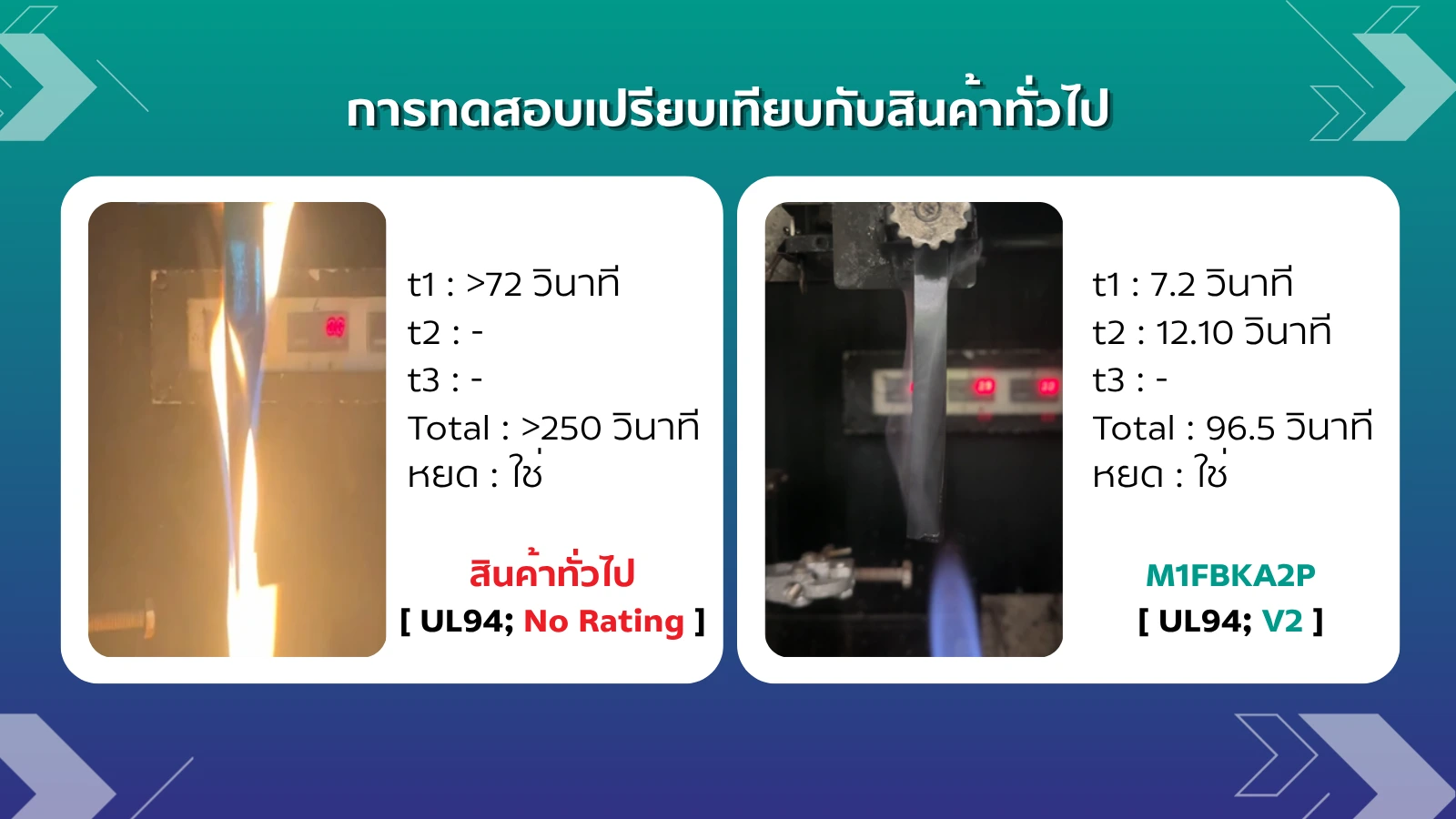 • UL94 V-2 (Vertical Burning) - Flammability Classification : สามารถยับยั้งการลามไฟภายในระยะเวลาที่กำหนดตามมาตรฐานการลามไฟ UL94 ระดับ V-2 ที่ความหนา 3 มม. มั่นใจได้ในประสิทธิภาพการหน่วงไฟ