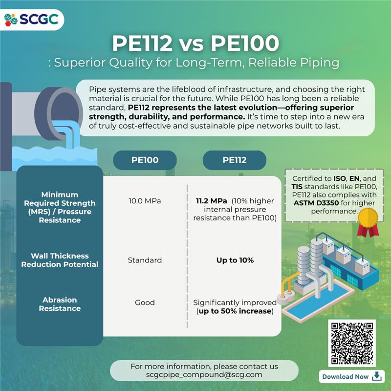 PE112 ช่วยเพิ่มประสิทธิภาพของระบบท่อได้อย่างไร? แม้ว่า PE100 จะเป็นวัสดุมาตรฐานของท่อพอลิเอทิลีนที่ได้รับความไว้วางใจมาอย่างยาวนาน แต่ PE112 คือนวัตกรรมก้าวสำคัญที่เข้ามาสร้างบรรทัดฐานใหม่ ทั้งในด้านความแข็งแรงที่เพิ่มขึ้น นำไปสู่ความมั่นใจในการใช้งานในระยะยาว วัสดุนี้ได้รับการออกแบบทางวิศวกรรมมาโดยเฉพาะ เพื่อให้รองรับการใช้งานในสภาพแวดล้อมที่ท้าทาย มอบอายุการใช้งานที่ยาวนานขึ้น พร้อมลดความถี่ในการบำรุงรักษา เหมาะอย่างยิ่งสำหรับโครงสร้างพื้นฐานที่ต้องการความมั่นคงสูง